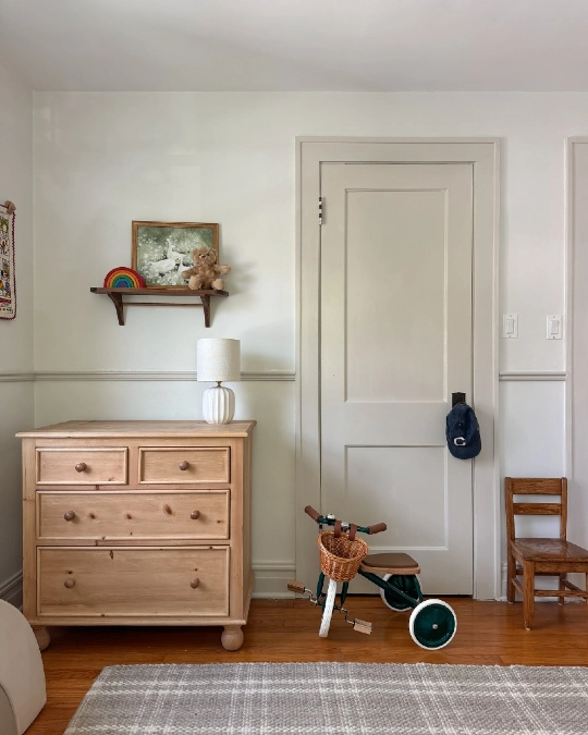 This charming nursery uses a soft greige on the door and lower wall trim. The color creates a gentle contrast against the lighter upper walls.