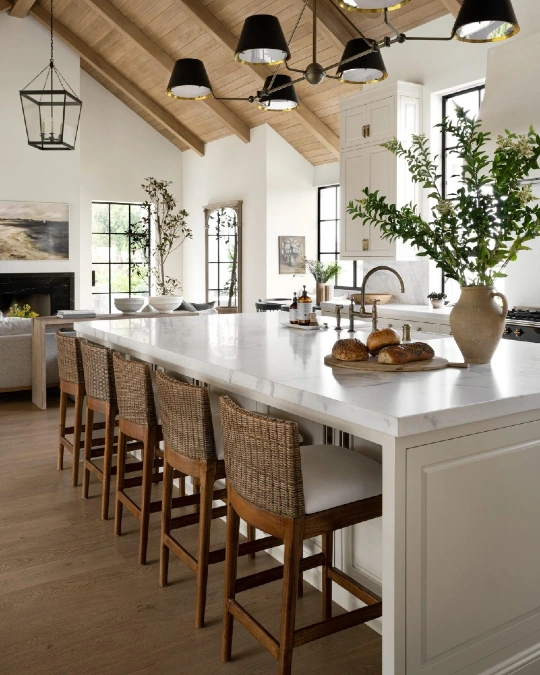 This large kitchen island features a soft white finish with warm undertones. The color complements the marble countertop and woven bar stools.