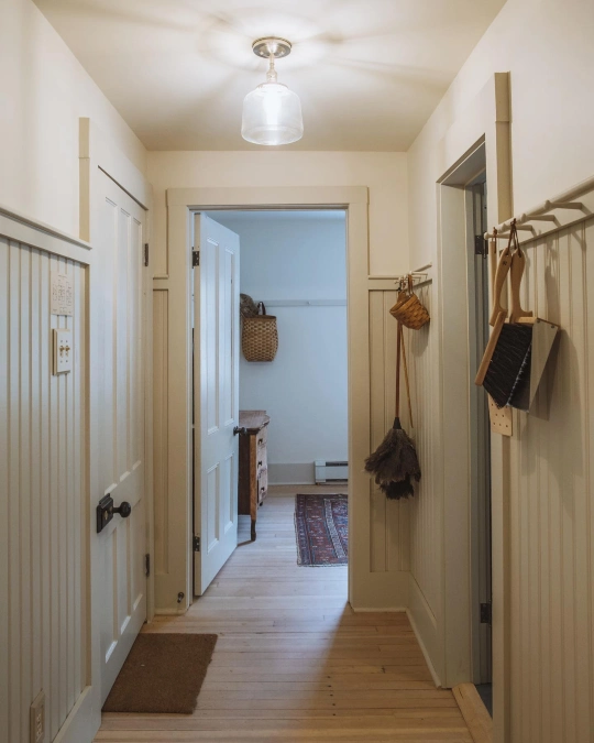 This narrow hallway features vertical beadboard paneling in a deep antique white. The creamy tone adds a layer of historic charm and warmth to the small passage.