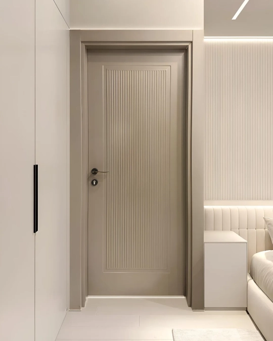 Vertical fluting on the door panel adds a layer of modern texture. Integrated warm lighting above the headboard enhances the cozy and sophisticated mood of the room.