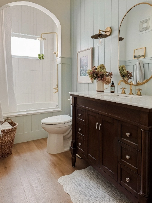 Gold fixtures and a dark wood vanity add warmth to the light green palette. White subway tiles in the arched shower area keep the small space looking bright.