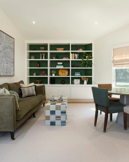 This functional living space features floor to ceiling white shelving with a bold forest green back panel. The dark accent color makes the white frame and decorative objects stand out.