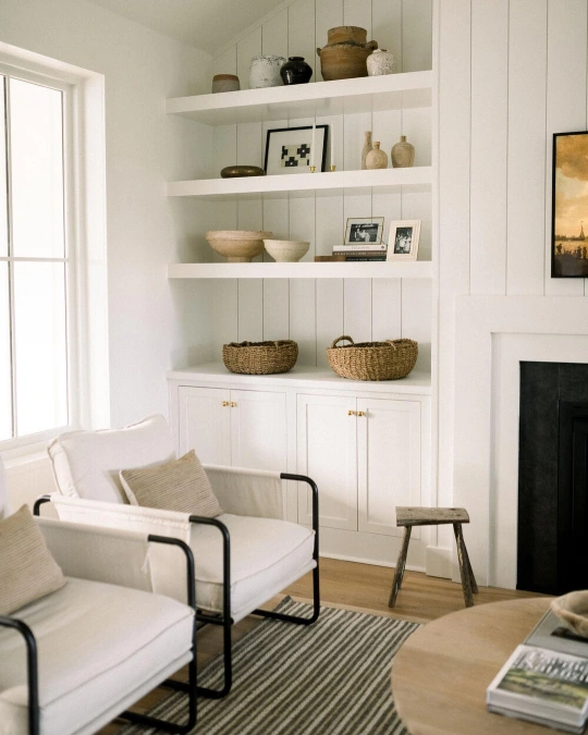 This nook features vertical shiplap in a warm parchment white. Sunlight streams through the large window to soften the shelf lines. Woven baskets and earthy pottery add texture to the neutral shelves.