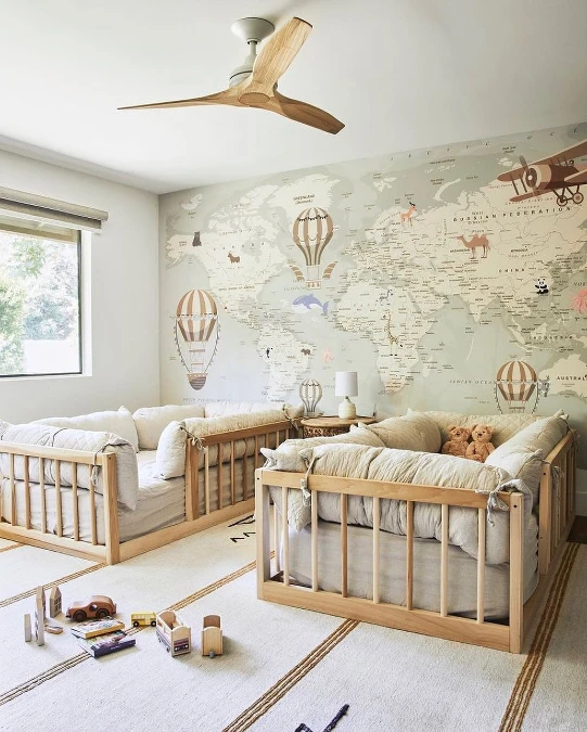 Pair this backdrop with neutral bedding and simple decor. Two matching wooden beds sit low to the floor here. A sleek fan hangs from the ceiling to keep air moving. Small toys on the striped rug complete the adventurous theme.