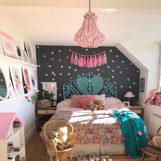 This bedroom includes a woven teal headboard with heart detailing. Small dots in various colors decorate the dark wall surface. A colorful floral quilt covers the bed. A braided pink tassel garland hangs above the headboard for another textured element.