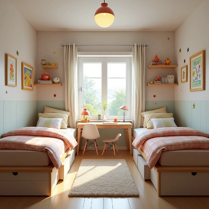 A narrow wooden desk and two small chairs occupy the space in front of the window. Matching small lamps sit on the desk and provide targeted light. Short wooden shelves hang above each bed for displaying books and toys. Colorful star stickers decorate the wall above the simple wainscoting.