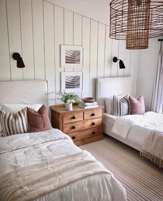 Combine different textures by pairing two beds with unique frames. One bed has a high wooden headboard with carved round finials. The second bed uses a curved, woven rattan headboard, adding a light, natural element. Both share an antique wooden dresser placed between them.