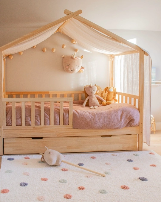 Build a cozy retreat using a wooden house shaped structure. Natural timber creates a sturdy and warm base for the mattress. Drape sheer white fabric over the roof beams to add softness. This simple addition makes the sleeping area feel private and safe.