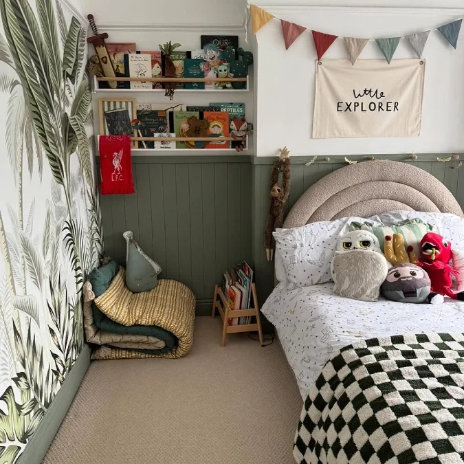 One wall features a bold, graphic jungle leaf wallpaper for a dramatic look. The opposite wall uses a lower panel of vertical wood paneling painted sage green. A white flag banner reads “Little Explorer” and hangs above the bed. Floating shelves hold a variety of books and toys nearby.