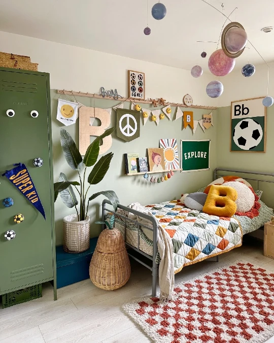 Hang a colorful solar system mobile from the ceiling to inspire dreams. Spheres representing planets in various sizes float above the bed. The room features soft sage green walls, creating a calming atmosphere. Large wooden block letters spell out a playful word on the wall.