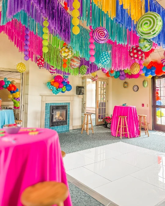 Rows of vibrant paper fringe in pink, teal, and purple create a festive ceiling canopy. Round candy-themed balloons and vertical balloon strands hang among the streamers to add a playful touch.