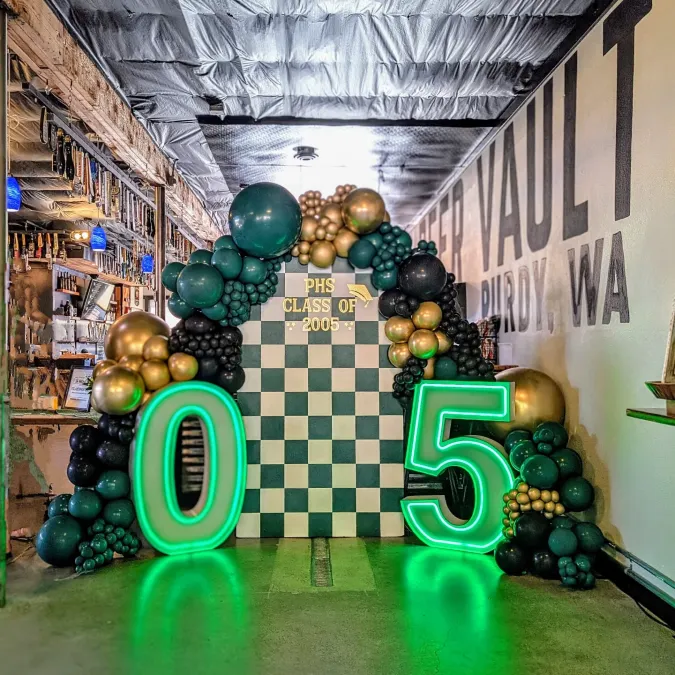Large neon green numbers stand out against a checkered backdrop to highlight the graduation year. Dark teal and gold balloons create a textured frame around the entire photo station.
