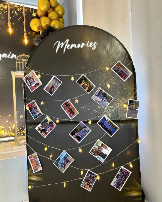 A sleek black arched board serves as a dedicated space for vintage school photographs. Thin strings of star shaped fairy lights crisscross the surface to illuminate each individual memory.