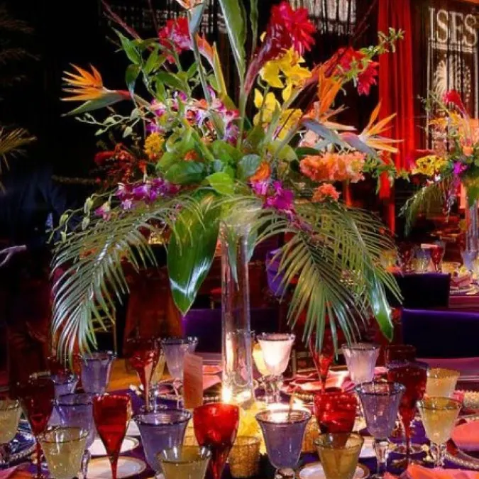 Small tea lights reflect off the colorful glass for a warm and intimate dining atmosphere. This exotic floral design brings a bold energy to large reception tables.