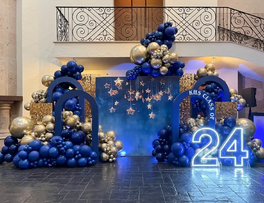 Navy blue and shimmering gold balloon clusters flow around sleek geometric arches to create a sophisticated focal point. Hanging rose gold stars dangle against a deep blue textured backdrop to mimic a night sky.