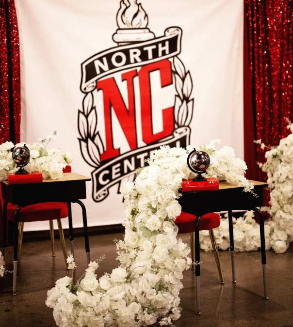 A massive banner with the school logo provides a bold background for this stage setup. White floral garlands spill off small black desks and pool on the floor like a flower waterfall.