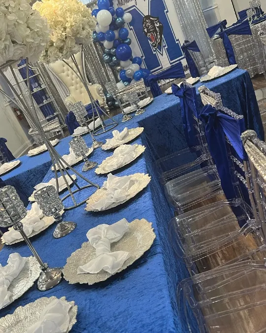 Vibrant royal blue tablecloths provide a bold foundation for these sophisticated reunion banquet tables. A shimmering gold sequin runner adds a luxurious texture that catches the overhead light beautifully.
