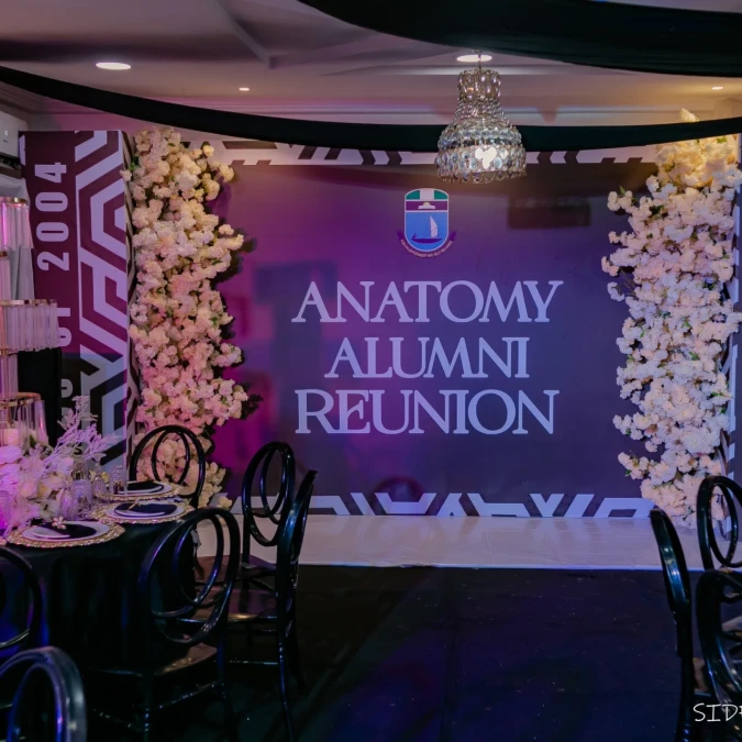 A large purple banner features bold white lettering to welcome former medical students. Cascading white floral pillars frame the display to add a soft and professional touch.
