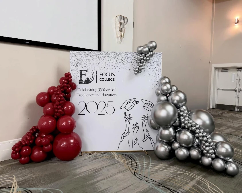 A clean white backdrop features the college logo and a bold “2025” graduation year. Minimalist line art depicts hands tossing graduation caps into the air to signify success.
