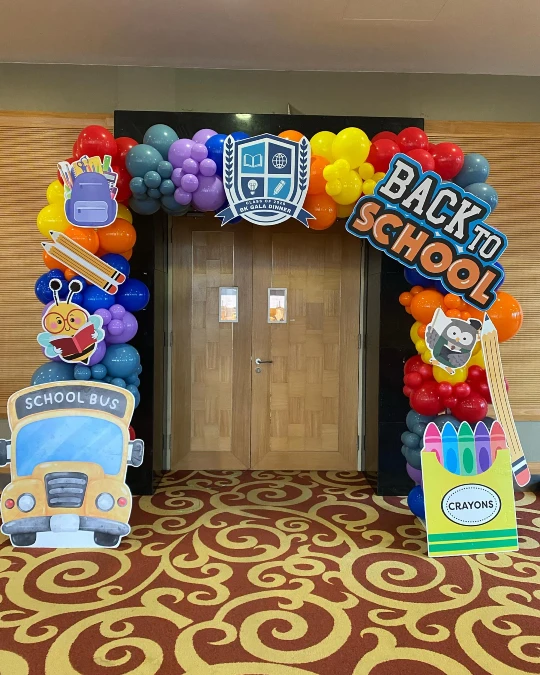 This entrance features a sprawling arch of multi-colored balloons in primary and secondary shades. Large cardboard cutouts of a yellow school bus, crayons, and an owl decorate the sides to enhance the theme.