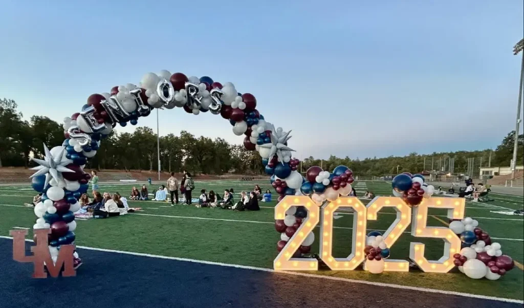 A towering balloon arch in white, navy, and maroon spans across the high school athletic field. Silver letter balloons spelling out “Seniors” crown the top of the inflatable structure.