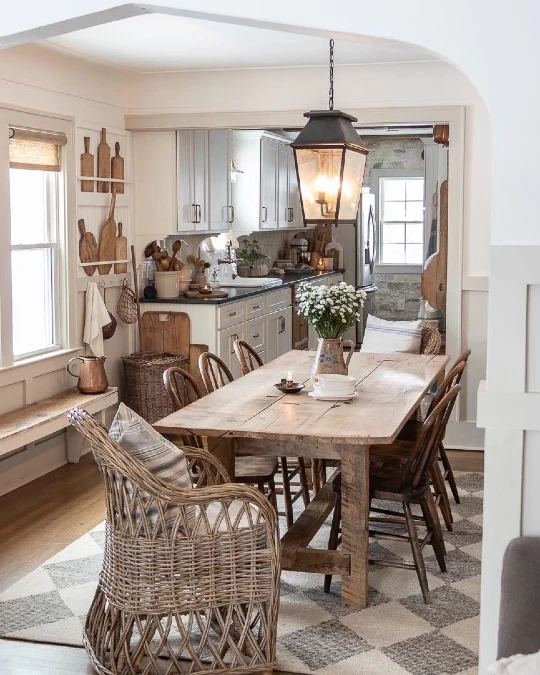 An oversized lantern fixture hangs above to light the room. Wooden cutting boards mounted on the wall serve as simple art. Fresh white flowers in a pitcher bring a touch of life to the table. The arched doorway offers a view into the bright kitchen beyond.