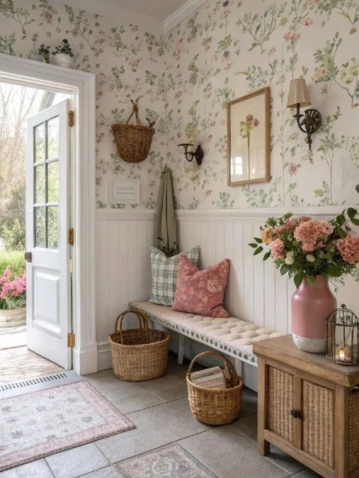 Delicate botanical wallpaper covers the upper walls of this welcoming hall. White beadboard adds a crisp contrast below the rail. A tufted cushion tops the bench to create a comfortable spot for rest.