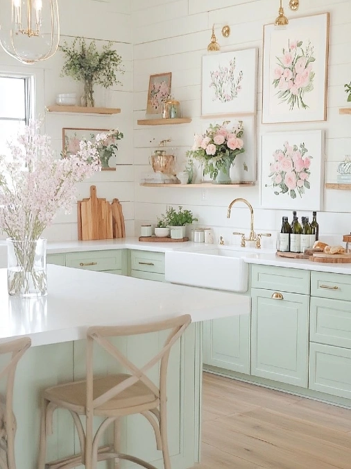 Mint green cabinets give this cooking space a soft and refreshing look. White shiplap walls provide a bright background for the decor. Framed floral prints hang in a structured layout to create a garden feel indoors. Gold sconces highlight the artwork from above to add warmth.