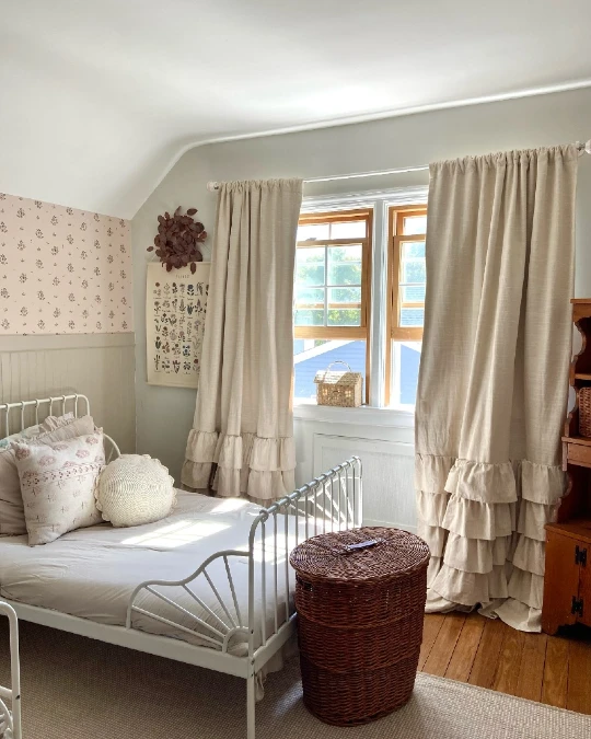 Delicate floral wallpaper pairs with beige wainscoting to create a sweet atmosphere in this room. Floor-length curtains feature tiered ruffles that add significant volume and texture. A white metal bed frame gives the space a classic vintage feel.