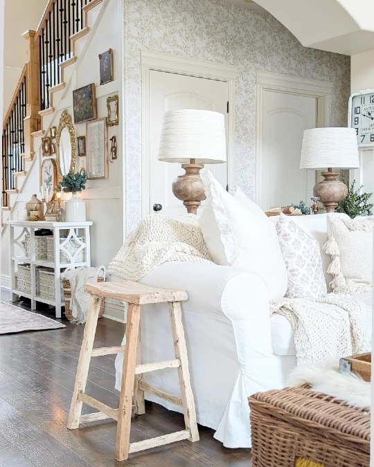 Subtle floral wallpaper covers the walls to create a gentle backdrop. A white sofa sits in the foreground with soft ruffled pillows. Chunky knit blankets add cozy layers for warmth.