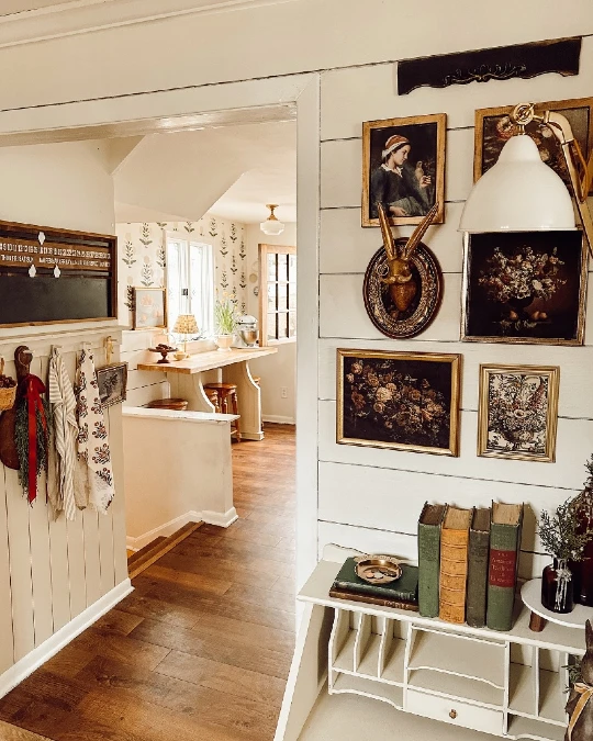 White shiplap walls serve as a bright canvas for this eclectic collection. Gold frames hold moody oil paintings to add deep character and history. A quirky gold rabbit head sits among the art as a playful accent.