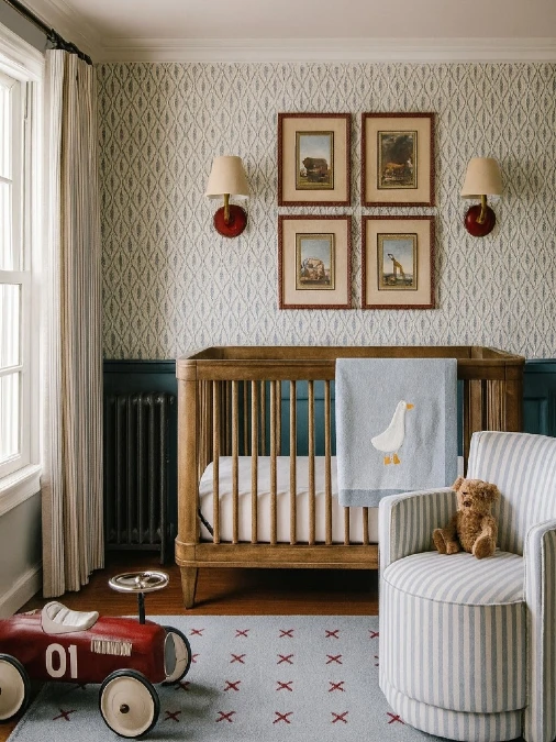 Patterned blue wallpaper creates a classic backdrop for this sweet room. A wooden crib anchors the space with its rich honey tones. Framed vintage art pieces hang in a neat grid above the bed. Red sconces add a bold pop of color to the walls.