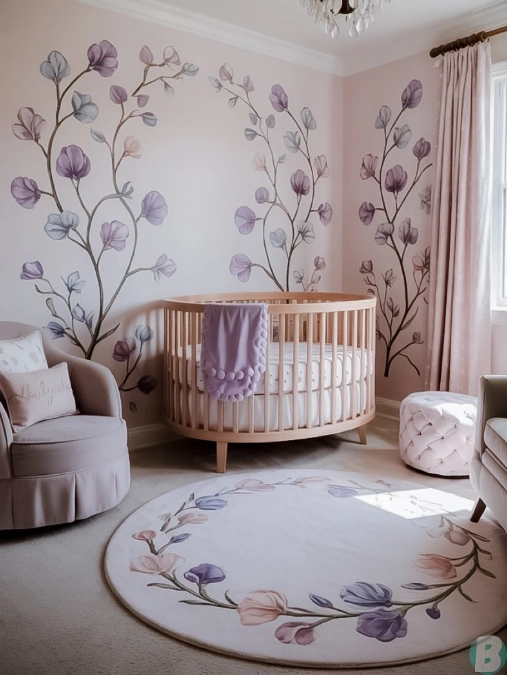 Large purple floral vines trail up the soft pink walls. These hand painted details bring a garden feel to the room. An oval wooden crib stands in the center as a focal point. A knit blanket with pom pom trim hangs over the rail.