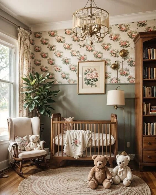 Pink rose wallpaper creates a vintage charm on the upper walls. Muted sage green paint balances the floral pattern below the rail. A tall wooden bookshelf holds a collection of colorful stories. The crib stands ready with a matching flower blanket.