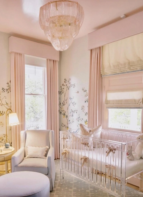 Delicate wallpaper features birds and yellow lemons on a fresh white background. Pale pink drapes with tailored valances frame the tall windows beautifully. A pink glass chandelier hangs from the ceiling as a statement piece. It fills the room with soft and elegant light.