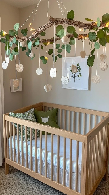 A thick tree branch hangs from the ceiling as a unique mobile. Warm string lights wrap around the rustic wood. Faux eucalyptus leaves add a splash of greenery. Little white hearts dangle down on thin strings.