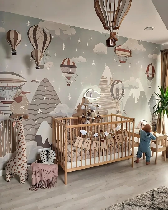 A playful wall mural fills the room with adventure. Hot air balloons float above painted mountains and clouds. Stars twinkle across the soft blue background.