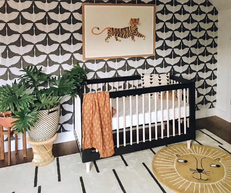 Black and white crane wallpaper makes a bold statement on the walls. A modern two tone crib matches the high contrast theme. A large framed tiger print hangs centered above the sleeping area.
