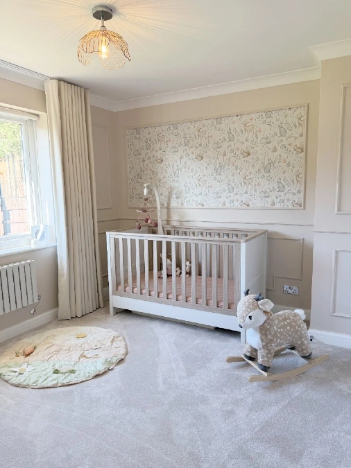Soft beige paneling creates a calm and neutral base for this room. A framed section of wallpaper features sweet forest animals like deer and rabbits. Light wood accents on the white crib match the natural theme. A wire light fixture adds a modern touch to the ceiling.