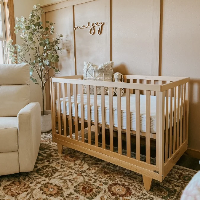 A natural wood crib stands out against the beige paneled wall. The name “maizey” appears in wooden script above the bed. This personalized detail adds a sweet feel to the room. A large faux tree brings a bit of nature into the corner.