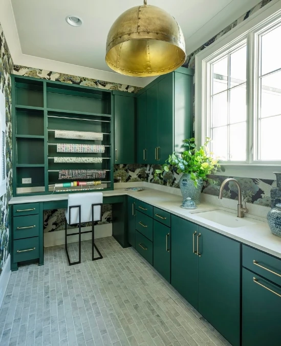 A large utility sink sits nearby for washing brushes or messy hands. Gold hardware adds a warm shine against the dark green wood. Crane patterned wallpaper creates a stylish backdrop for your creative tasks.