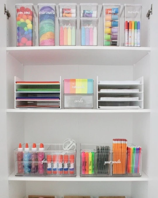 Divided trays hold glue sticks and pencils in neat rows to prevent rolling. Horizontal paper sorters keep cardstock flat and easy to grab during a project. You can maintain a tidy look while storing hundreds of small pieces.