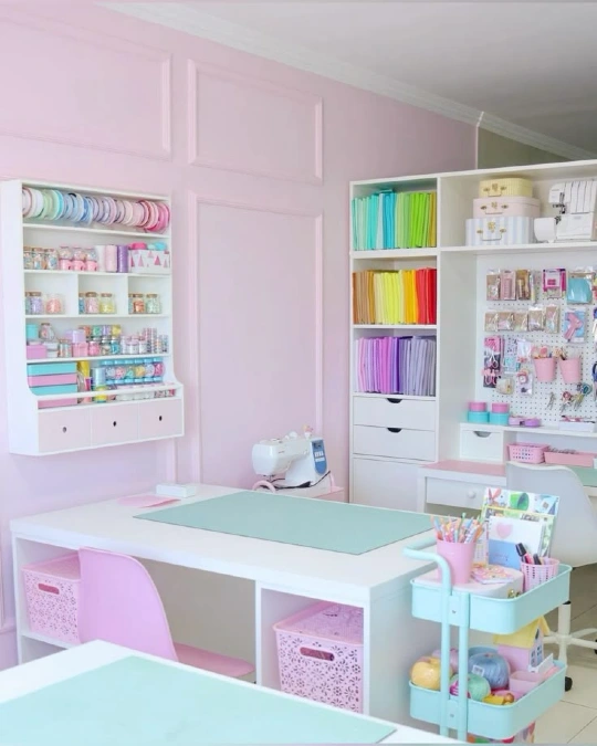 A white wall unit holds small jars of glitter and sequins in neat rows. Pink drawers at the bottom store tiny tools while pastel ribbons line the top shelf. This vertical storage keeps your desk surface clear for cutting mats.