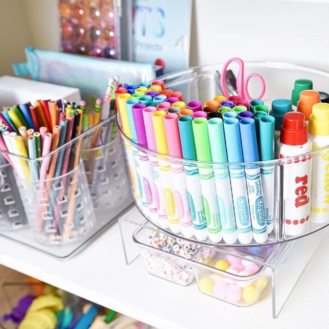 Small acrylic risers create extra surface area for tiny bead containers. Transparent bins ensure you see every supply before you start drawing. Organized markers look like a bright rainbow on your white shelf.