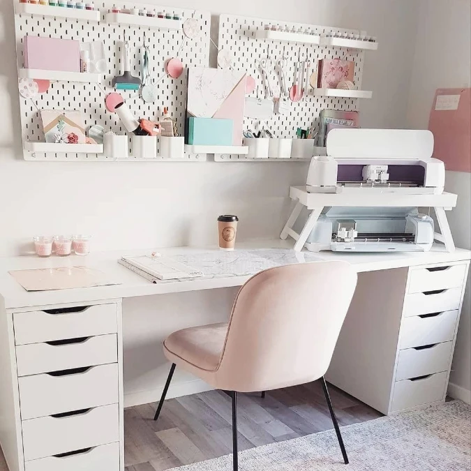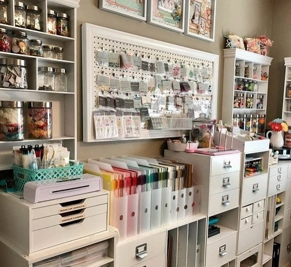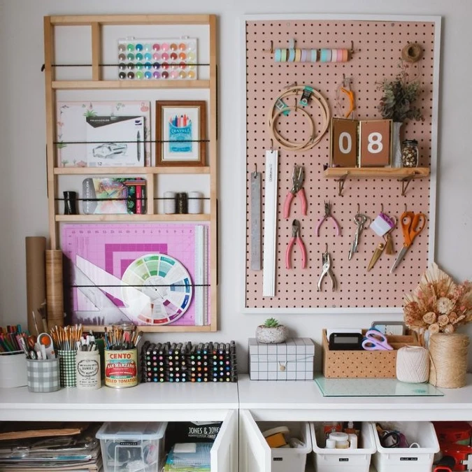 White pegboards turn empty walls into smart storage hubs for your tools. Hooks and small bins hold scissors or brushes within reach.