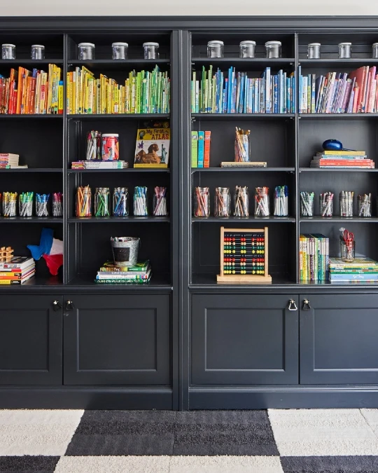Dark navy built in shelves create a bold backdrop for colorful craft materials. Books stand in color order to make finding a specific title easy.