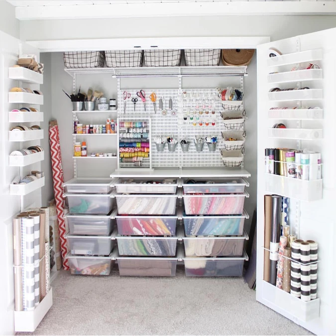 Large clear bins slide into a wall mounted frame to store fabric and bulky items. White shelving units on the doors hold rolls of paper and small paint jars.