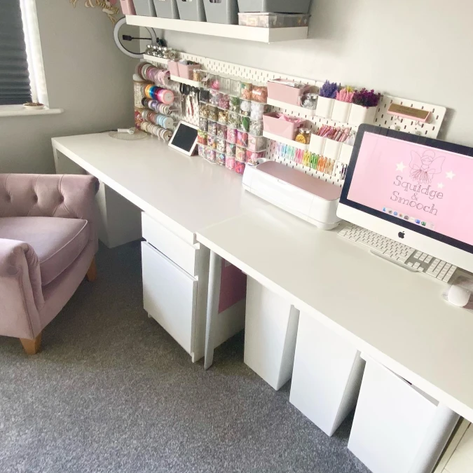 White pegboards mount directly above the long work surface to hold small items. Pink bins and clear jars hang from hooks to keep pens and beads within reach.