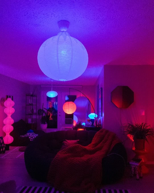 Large round paper pendants diffuse light evenly across the ceiling. These fixtures soften the glow while filling a dark room with bold, saturated color.