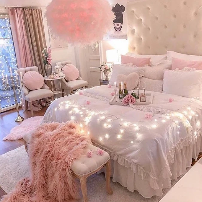 Pink fluffy textures combined with sparkling lights brighten every corner of the sleeping area. This simple addition turns a low light space into a glowing sanctuary for relaxation.